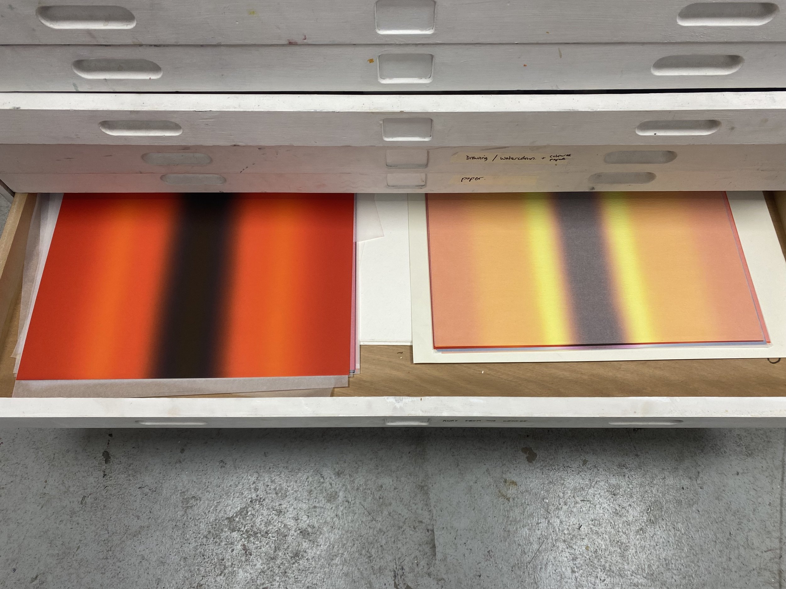 Stacks of colorful papers with gradient patterns in red, orange, yellow, and black, stored in a drawer. Written labels are visible on the side of the drawers.